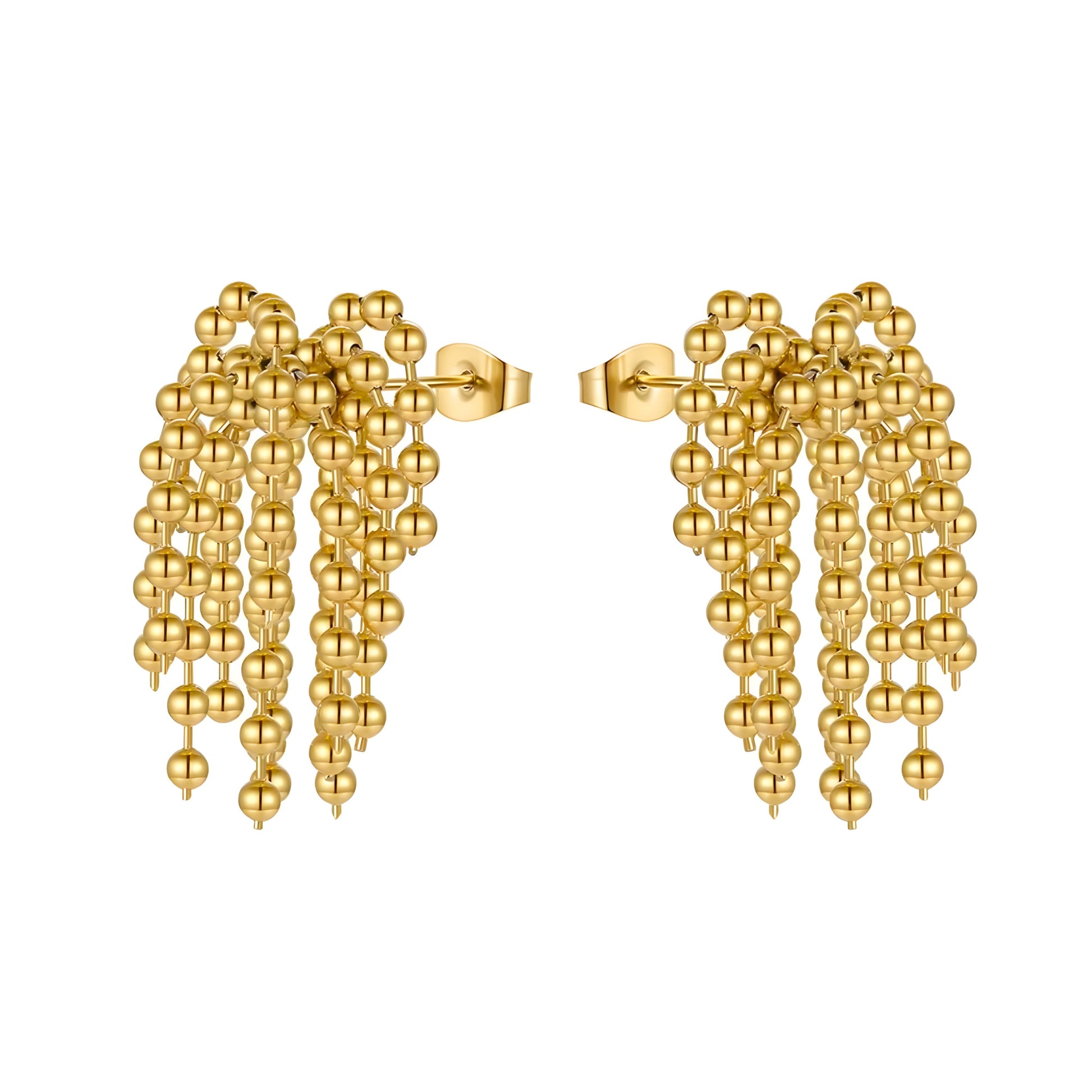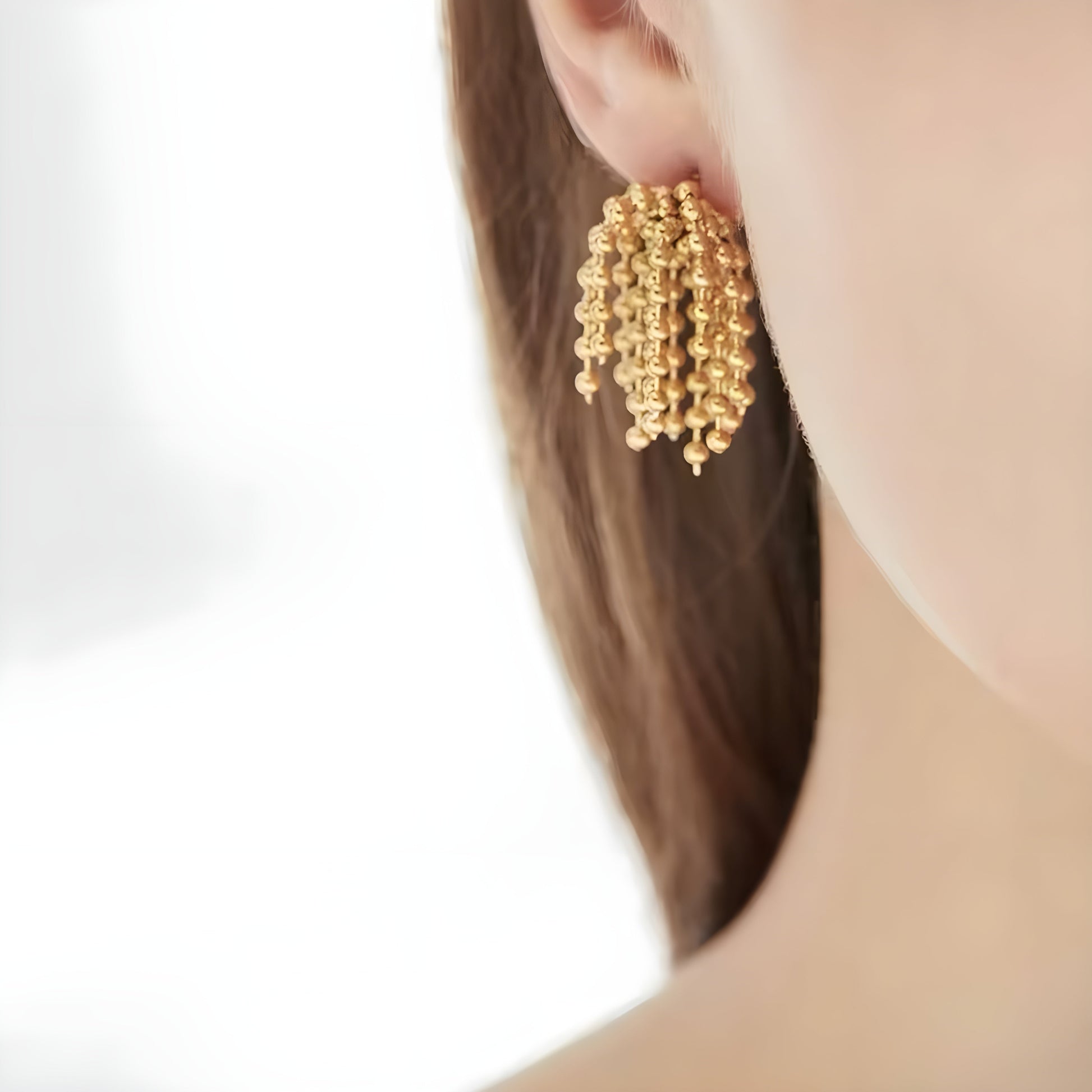 These luxurious and fashionable earrings from Behi Collection showcase a perfect blend of elegance and boldness. Their design features multiple cascading gold-plated chains (Double Gold Plated) that create a shimmering and eye-catching effect, making them a standout accessory.