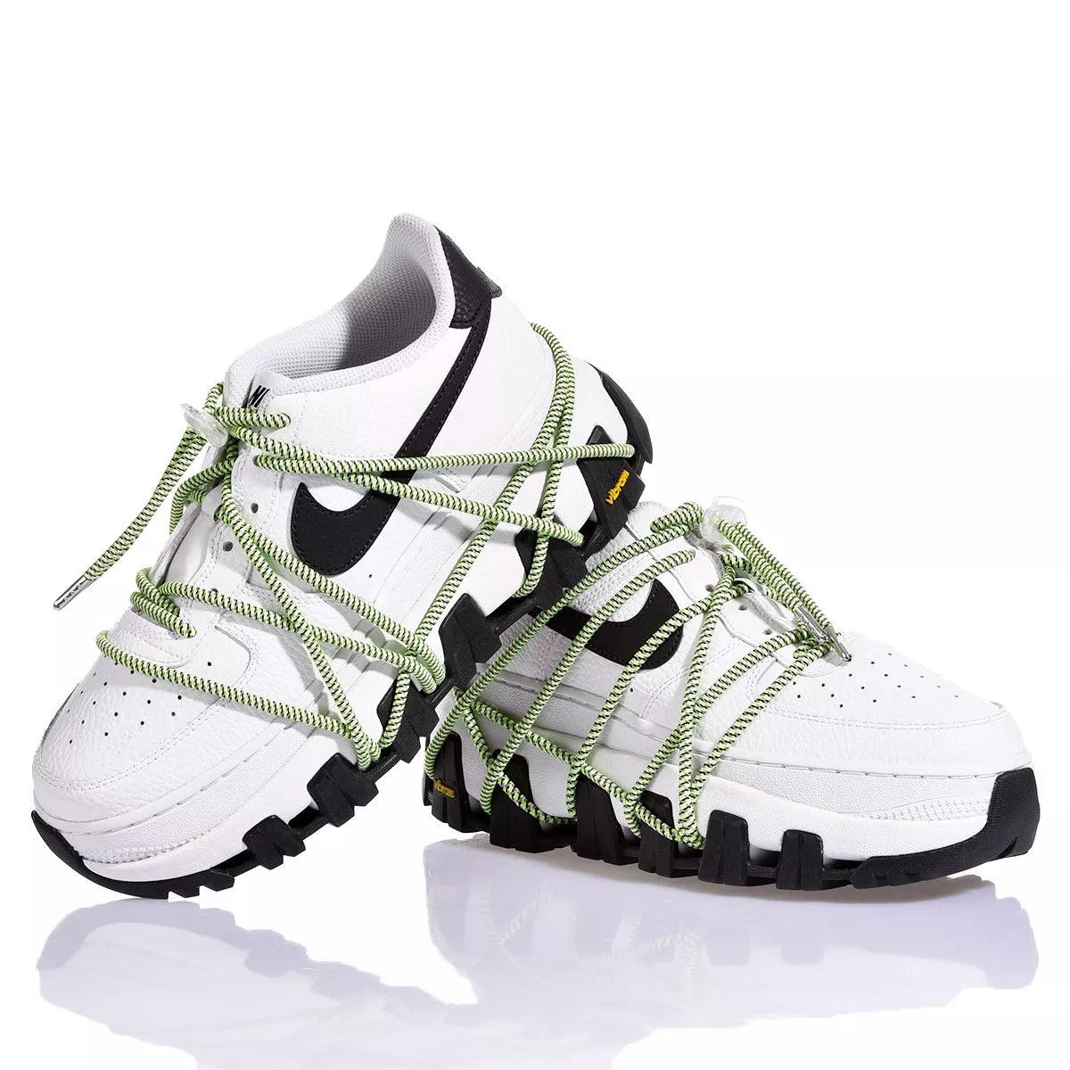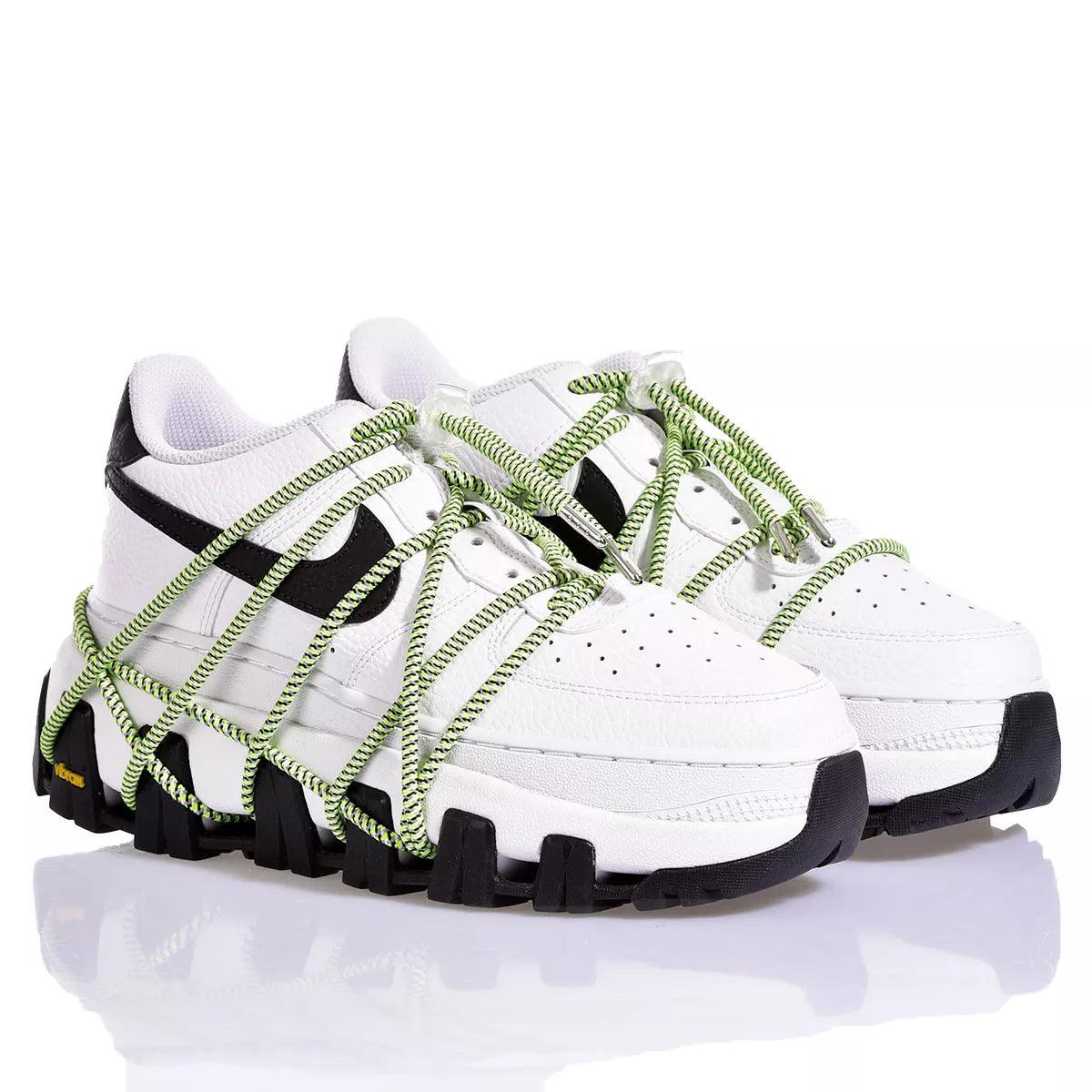 The Nike Air Force 1 Vibram Pack is the custom sneaker you weren't expecting! The iconic Nike model meets Vibram sole technology with the Mimanera interpretation: a playful interweaving with elastic laces in neon shades that completely covers the upper, extending through the sole. The transparent stopper makes it easy to adjust the weave, create your own pattern, or change the laces. You can personalize your pair of Nike AIR FORCE 1 Vibram Pack whenever you want!