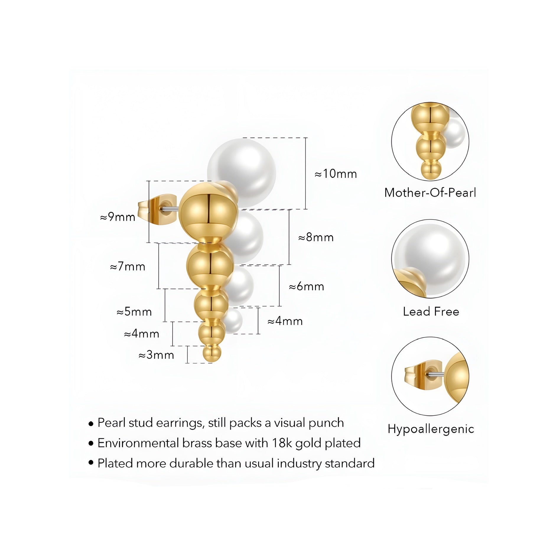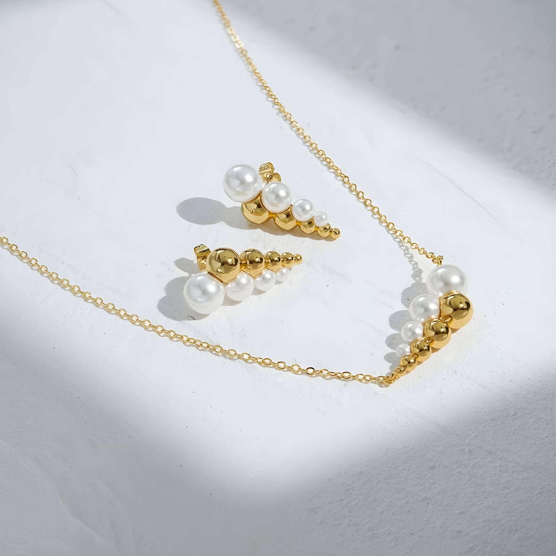 Realizzati in ottone placcato oro 18k PVD con perle imitation, questi gioielli catturano lo sguardo grazie alla loro composizione di sfere dorate in diverse dimensioni.