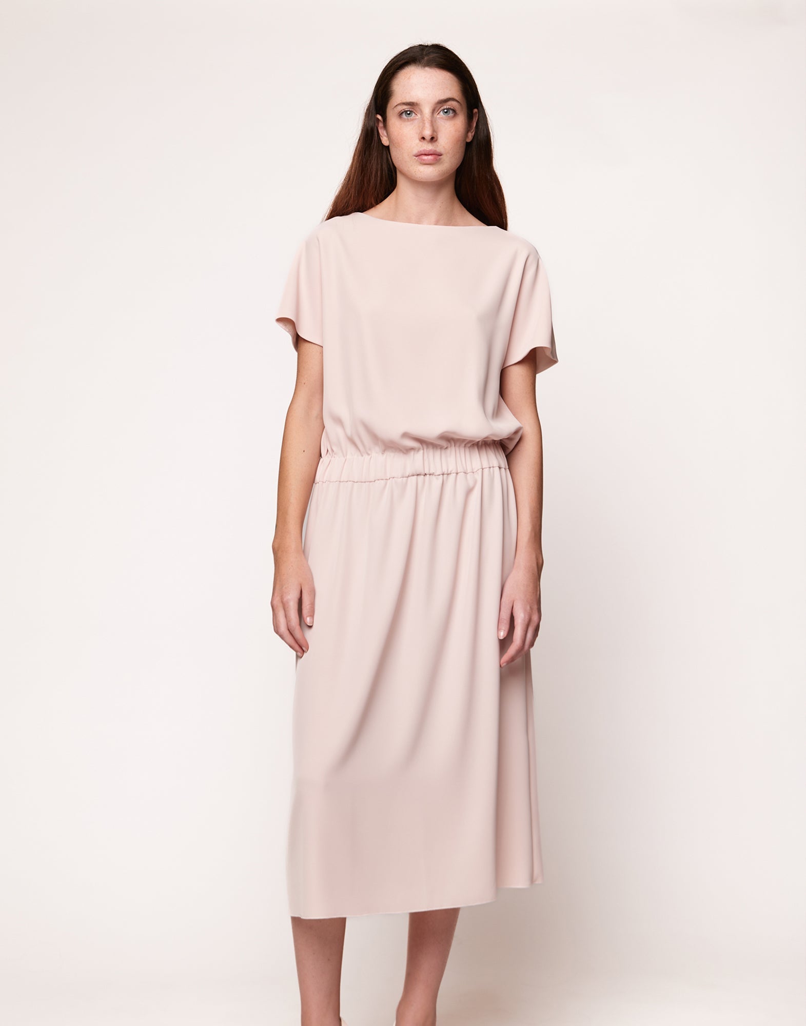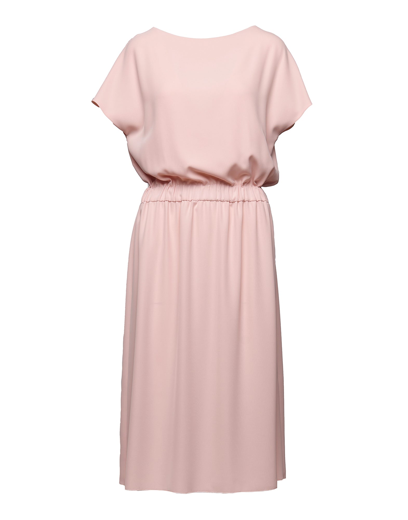 L’abito Mirtillo di DOUUOD è un elegante longuette con una silhouette raffinata e versatile. La vita elasticizzata e lo scollo a barca, accompagnato dalla manica corta, aggiungono un tocco di freschezza al design. La gonna sotto al ginocchio dona un aspetto femminile e sofisticato, mentre il Cady Fluido, con la sua texture morbida e fluida, garantisce una vestibilità perfetta per ogni occasione. Un abito che riesce a mescolare eleganza classica e modernità, ideale per eventi speciali e look informali.