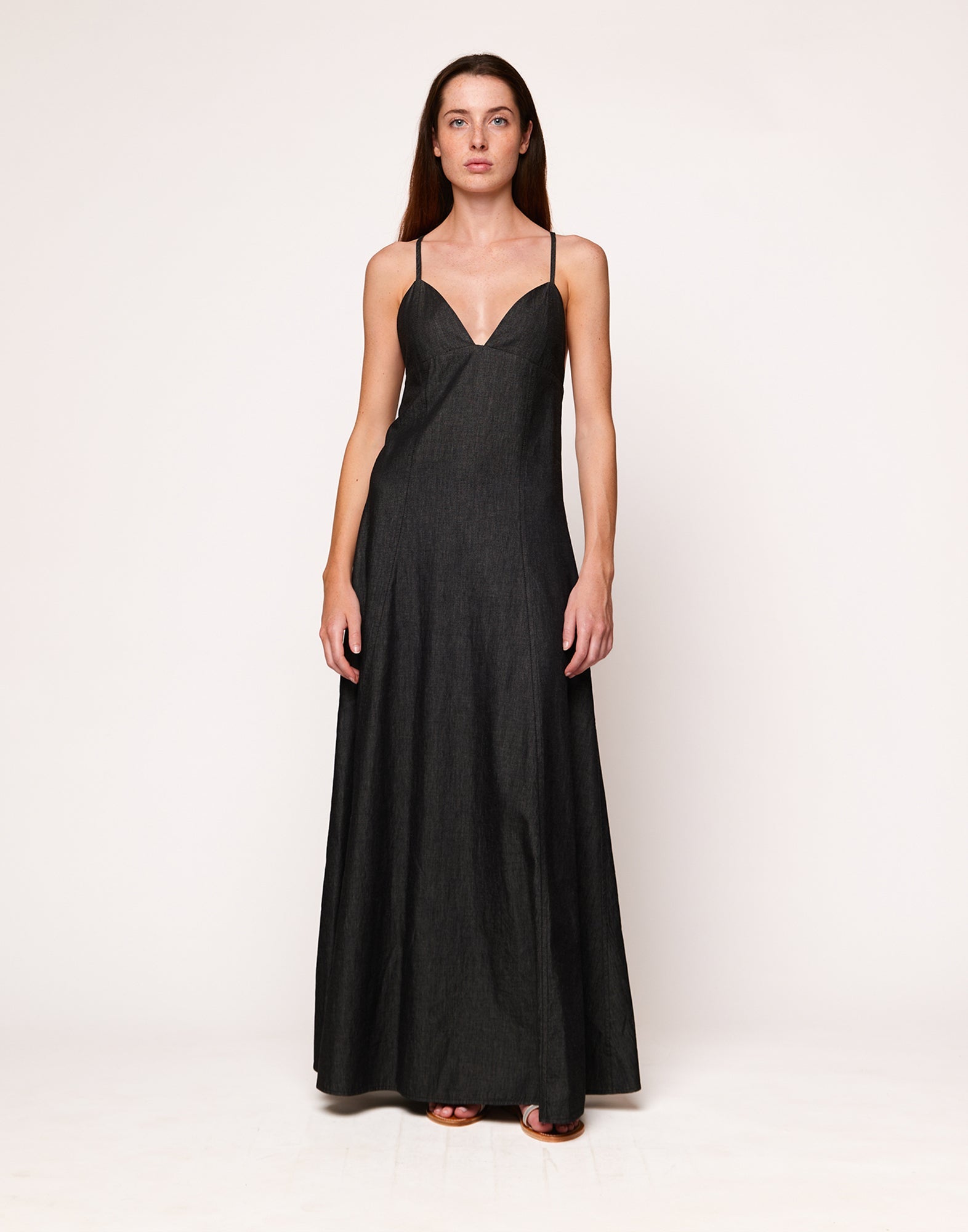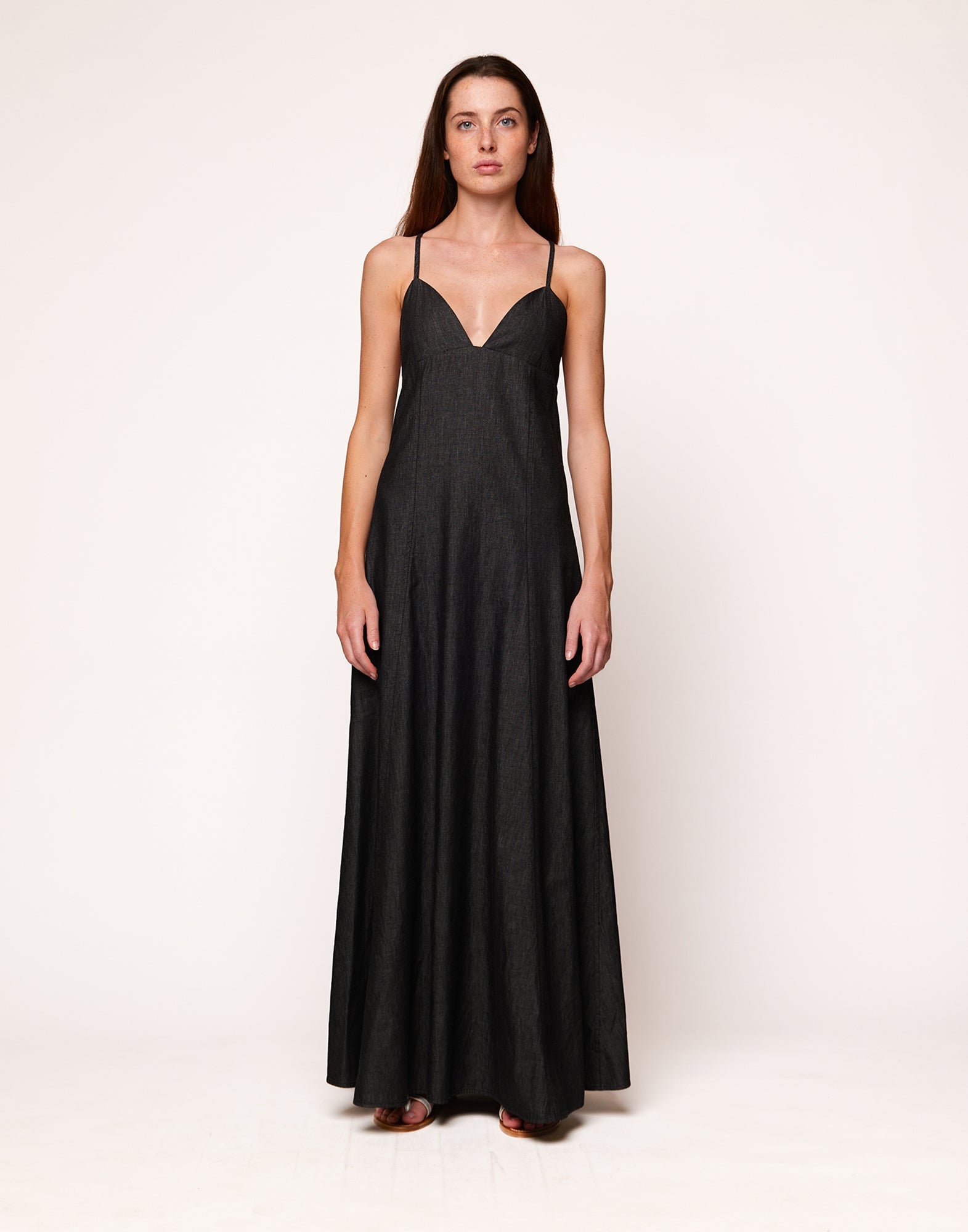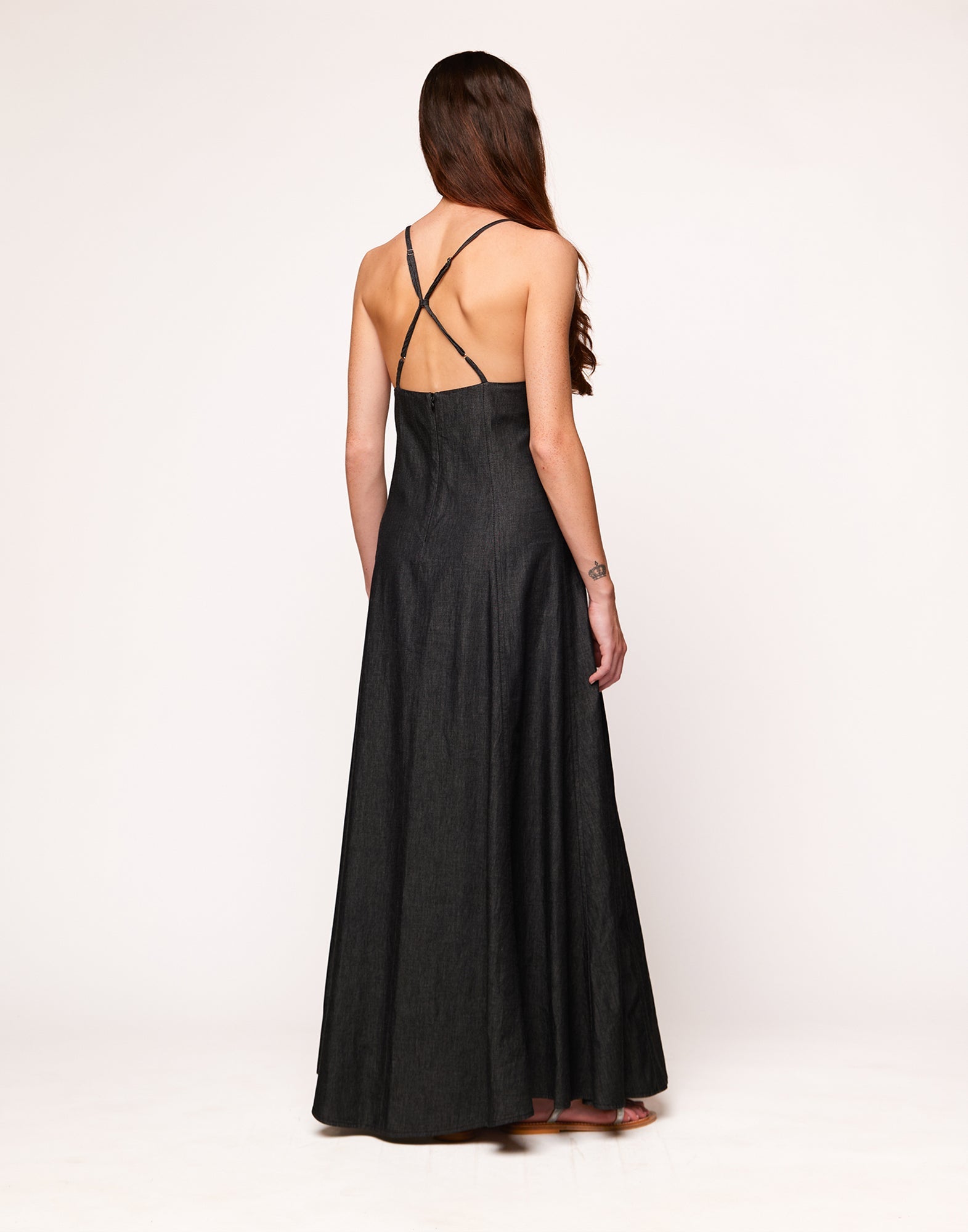 L'abito Timo di DOUUOD reinterpreta il classico stile sottoveste in una versione sofisticata grazie al Taylored Black Denim, un tessuto che unisce l'eleganza del nero con la struttura del denim. Il design presenta uno scollo a cuore e sottili spalline regolabili che si incrociano sul retro, offrendo un tocco di femminilità e carattere. La chiusura posteriore con zip nascosta assicura una vestibilità impeccabile, mentre la silhouette lunga esalta la figura con naturalezza.