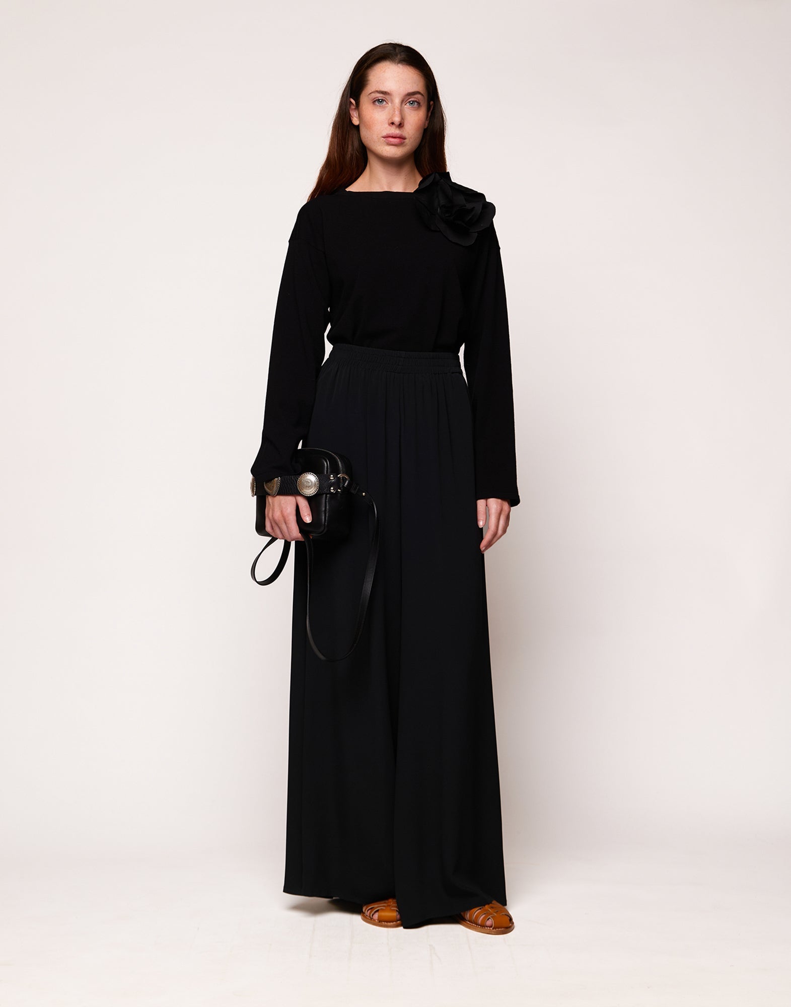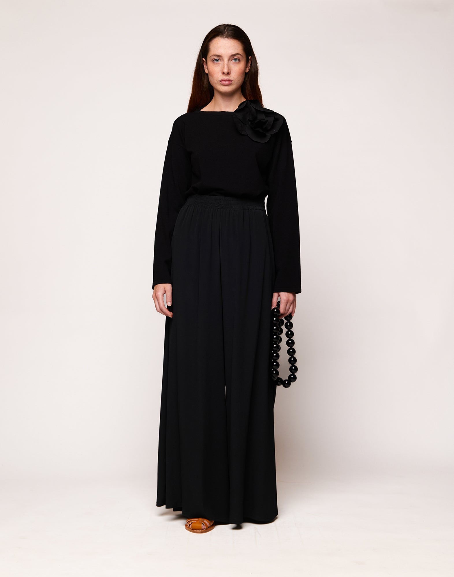 I pantaloni Perseo di DOUUOD offrono un’eleganza sofisticata grazie alla loro linea ampia a zampa e alla leggerezza del Crepe de Chine, un tessuto pregiato in acetato e seta che assicura fluidità e comfort. L'elastico in vita garantisce una vestibilità perfetta, mentre le tasche laterali aggiungono un tocco di praticità. Ideali per un look raffinato e versatile, perfetti da abbinare a bluse morbide o top strutturati.